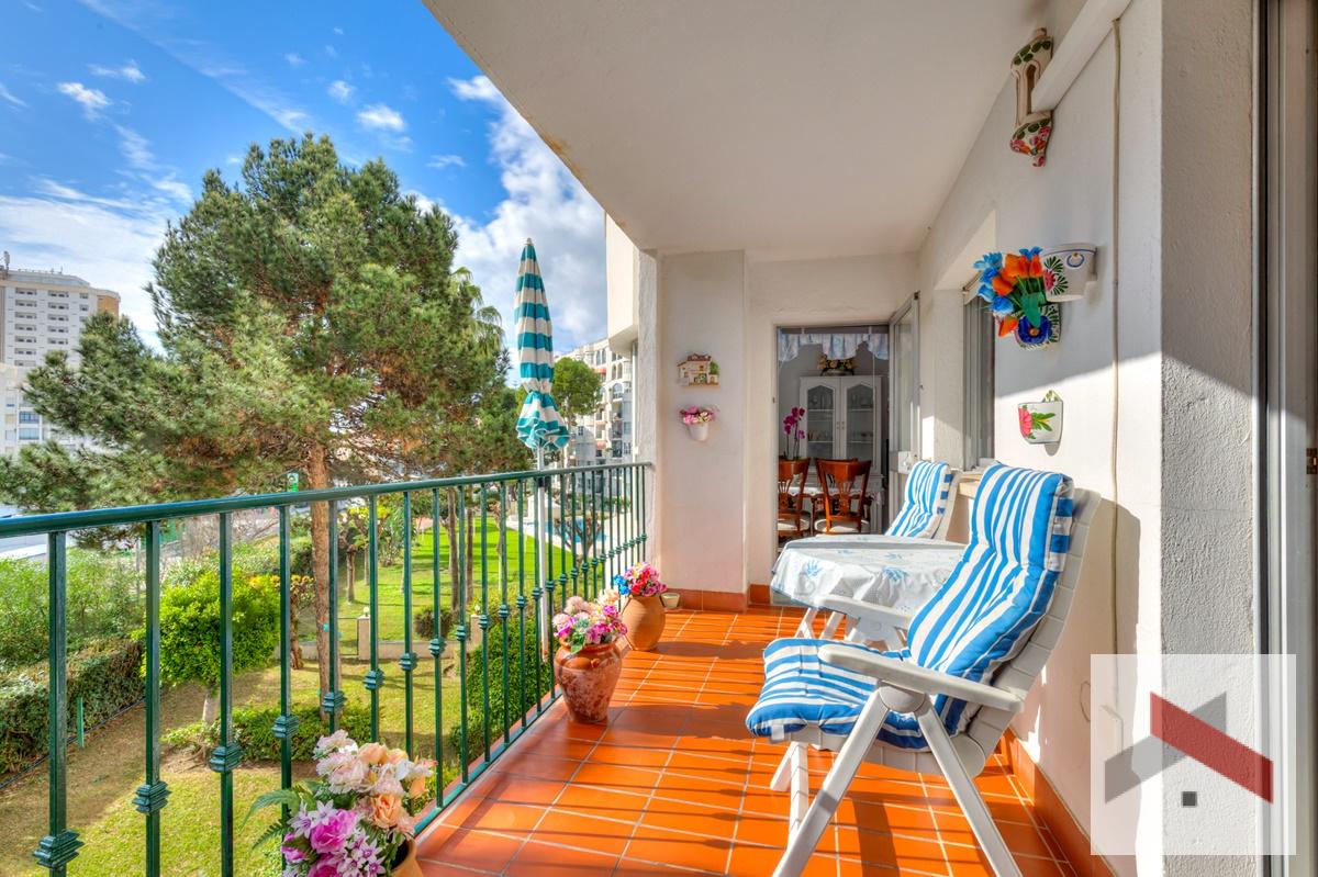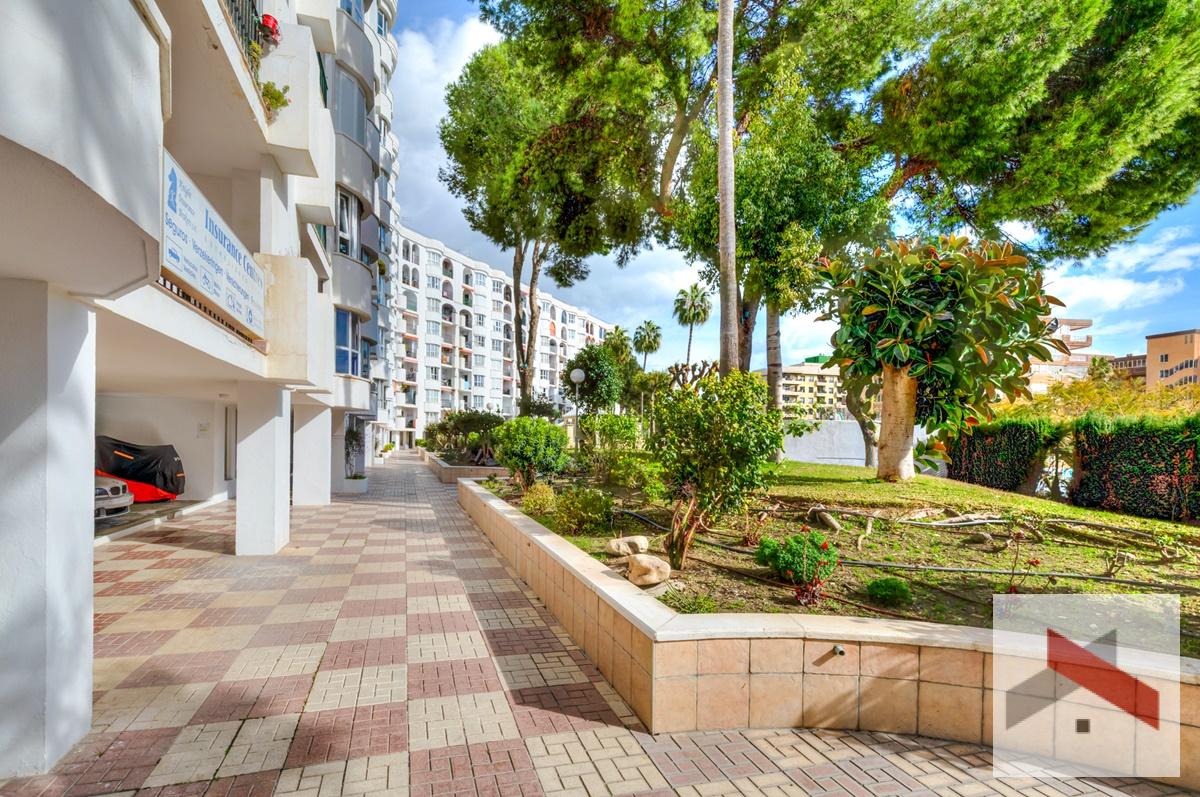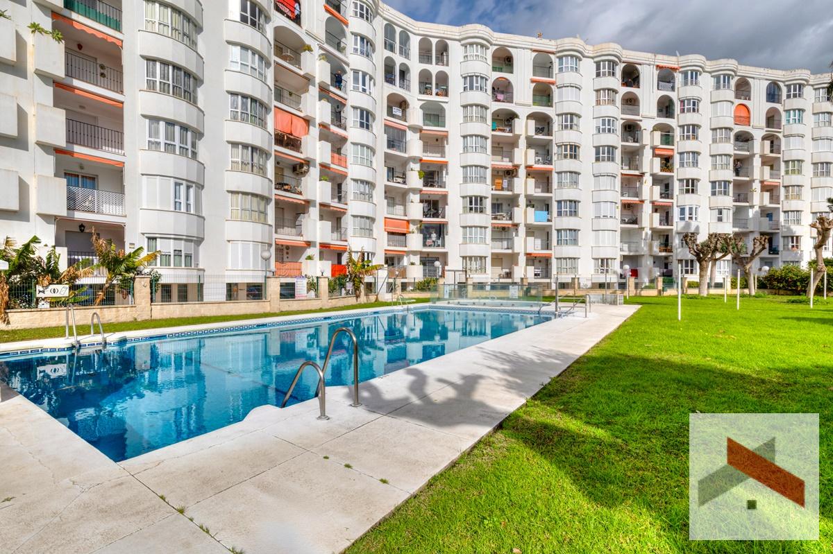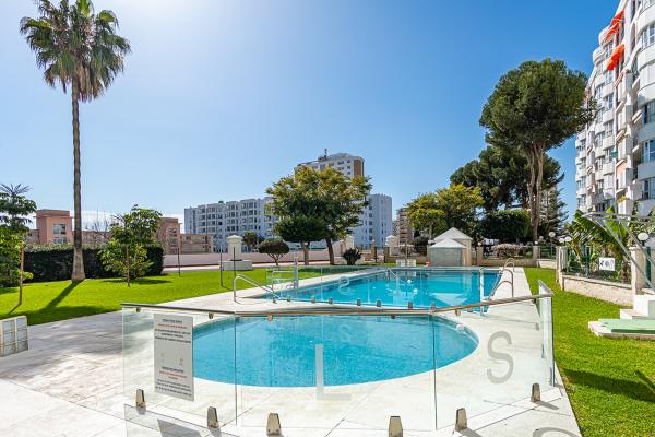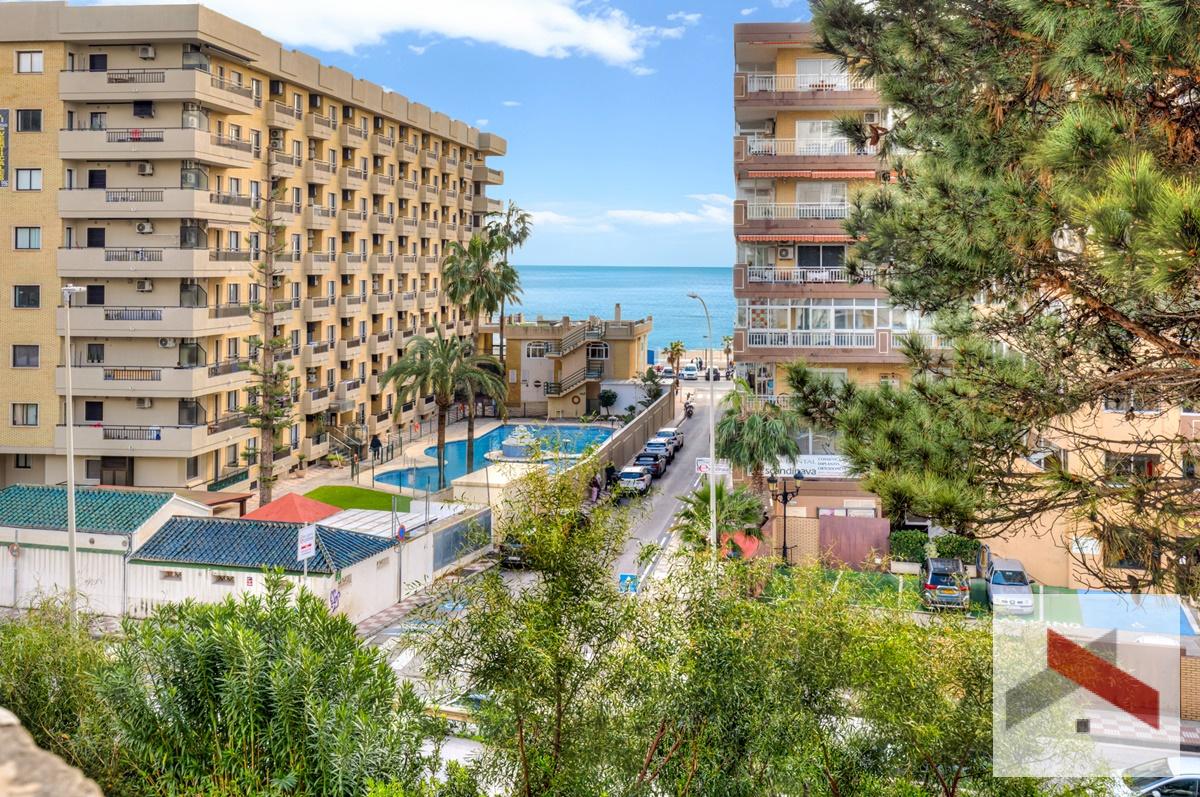 Amplio y luminoso Apartamento situado a solo 200 metros de la playa y a 450 metros de la estación de tren de Los Boliches. A poca distancia de restaurantes y tiendas. El apartamento cuenta con una bonita terraza de unos 10 m² orientada al sur con vistas al mar y al jardín comunitario con piscina.