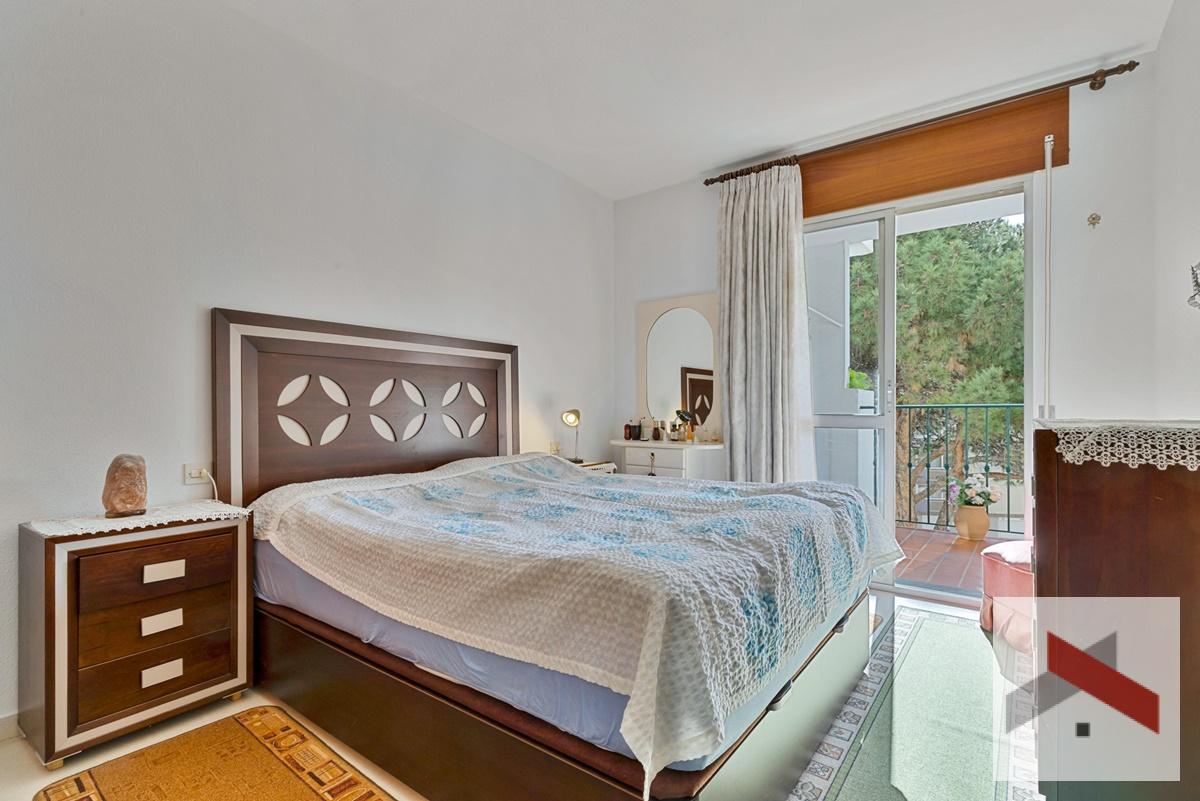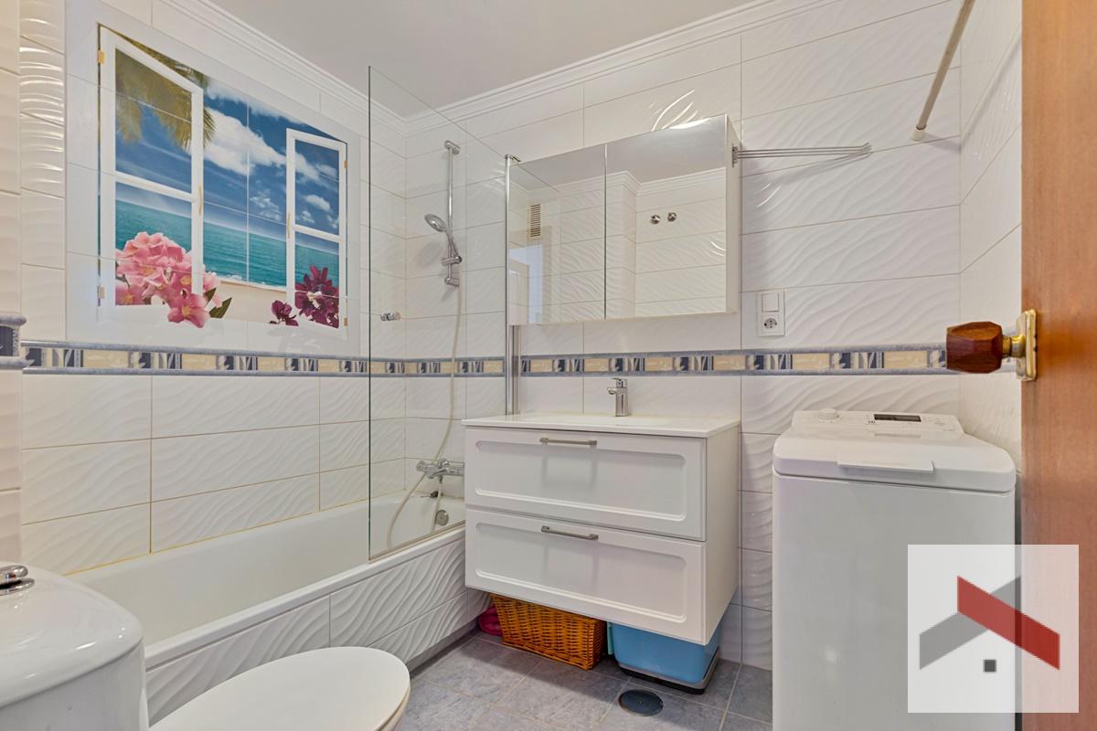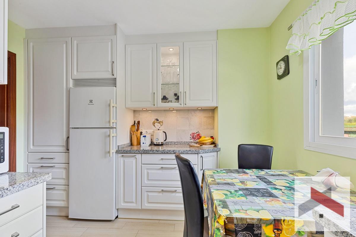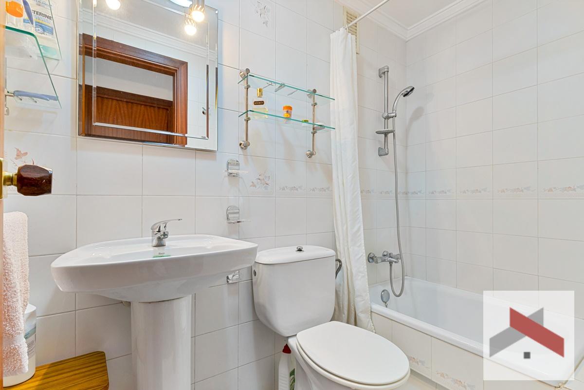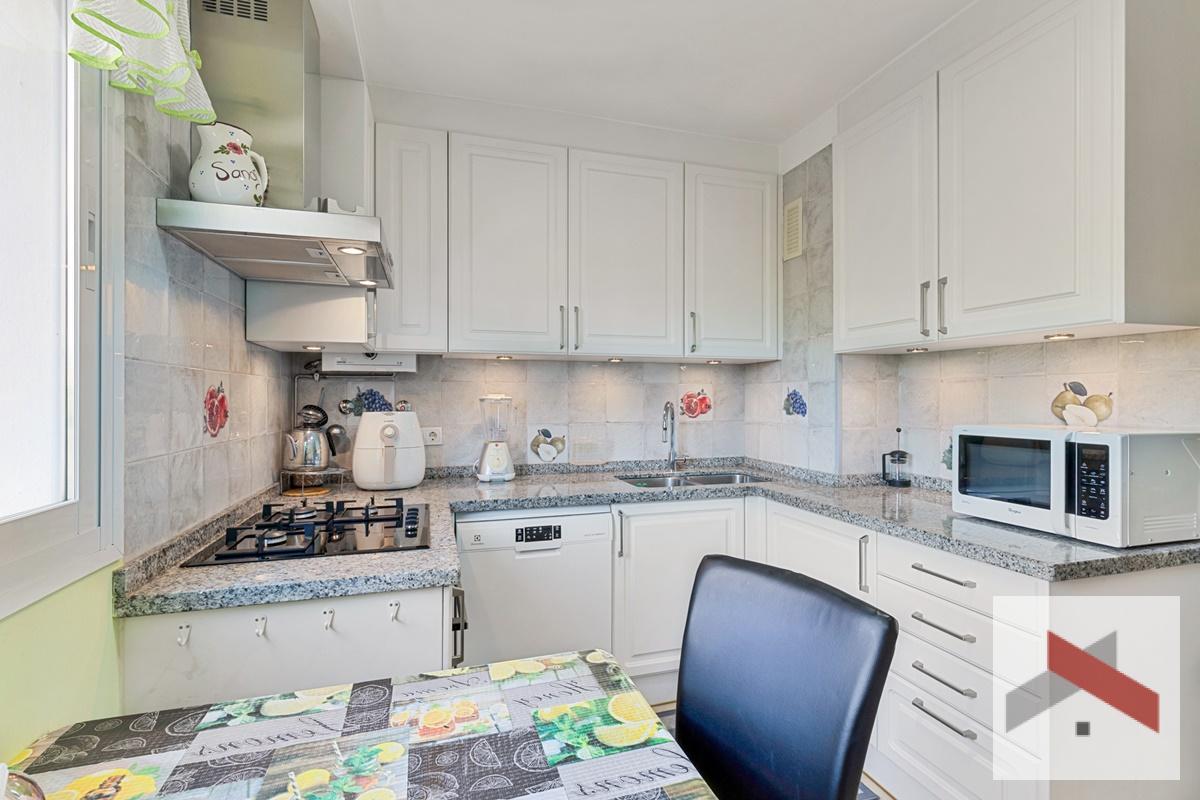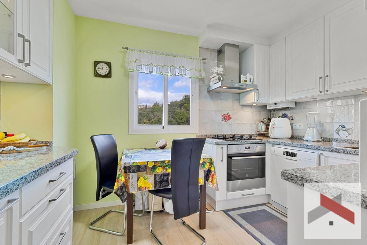 El apartamento originalmente tenía 3 dormitorios, pero uno de ellos se ha abierto al salón, por lo que ahora cuenta con 2 dormitorios y 2 baños. La cocina ha sido reformada y tiene espacio para una pequeña mesa de comedor.